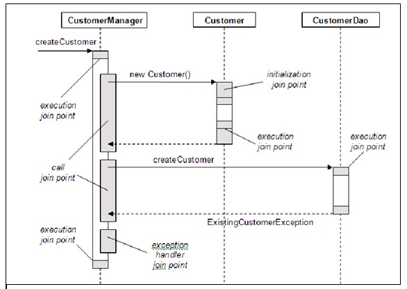 Debe notarse la diferenciación entre llamar y ejecutar un método. Los puntos de unión asociados a la llamada a un método tienen acceso a la información del contexto de ejecución antes de la llamada al método. Los puntos de unión asociados con la ejecución de un método tiene acceso a la información del contexto de ejecución dentro del cuerpo del método.